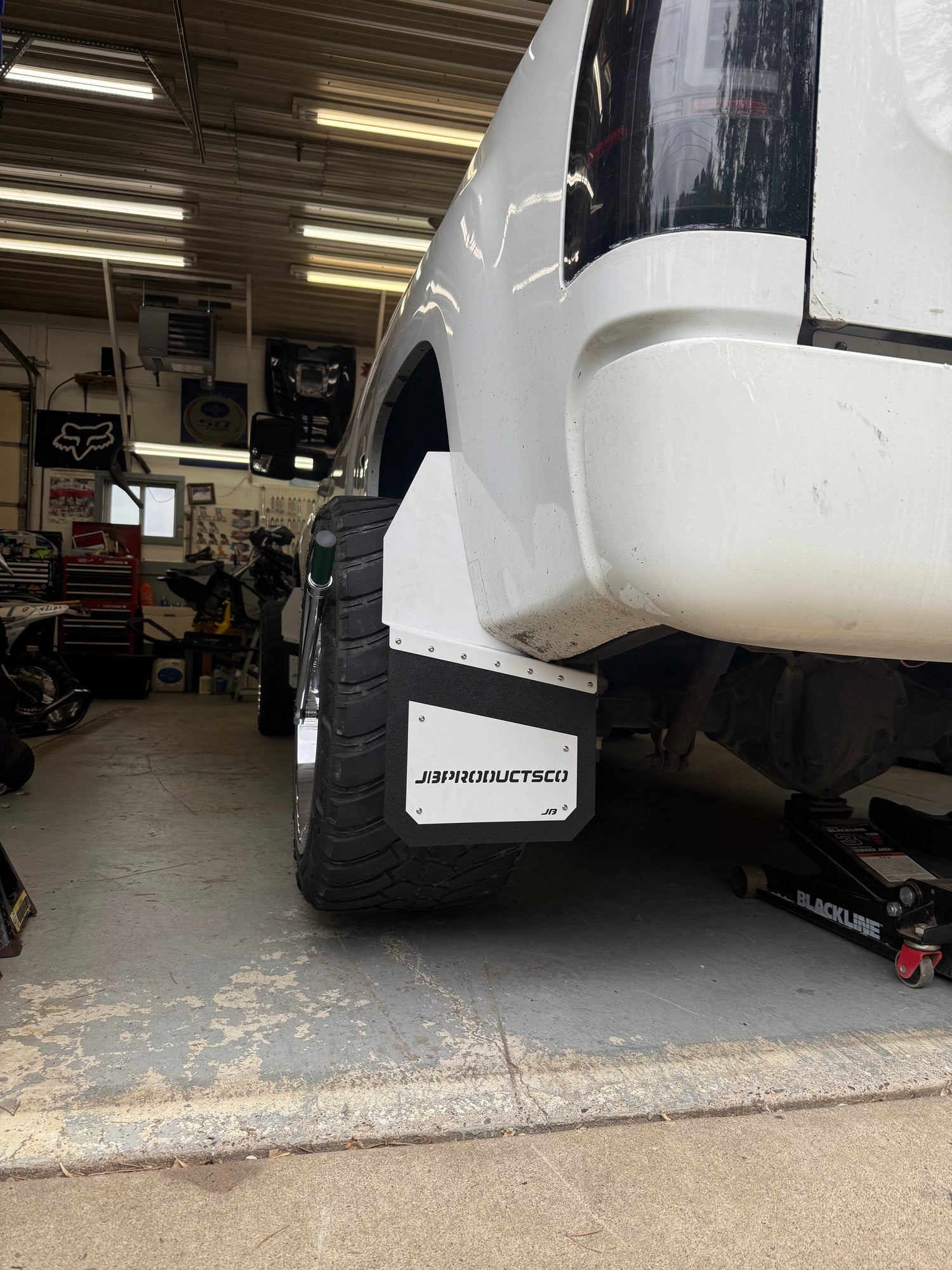 One off version of our mudflaps on Nicks F150. Full plastic kickback and mudflap with a stainless weight plate.