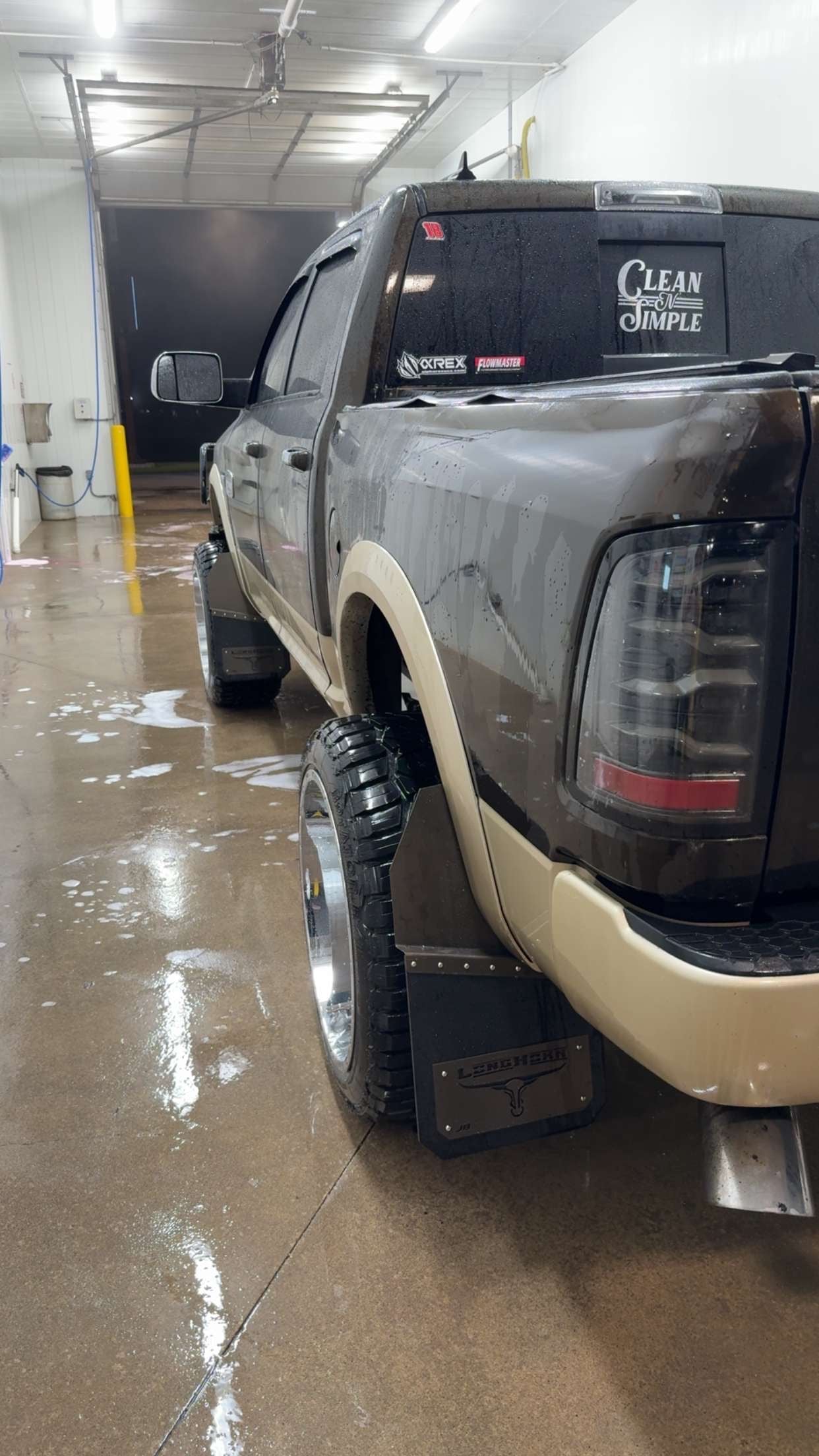 Customer chose to support us so we tossed our logo on his weight plates. 13in universal kickbacks with a set of 14 wide wheels on the truck. Wheels barley stuck out past the mudflaps!