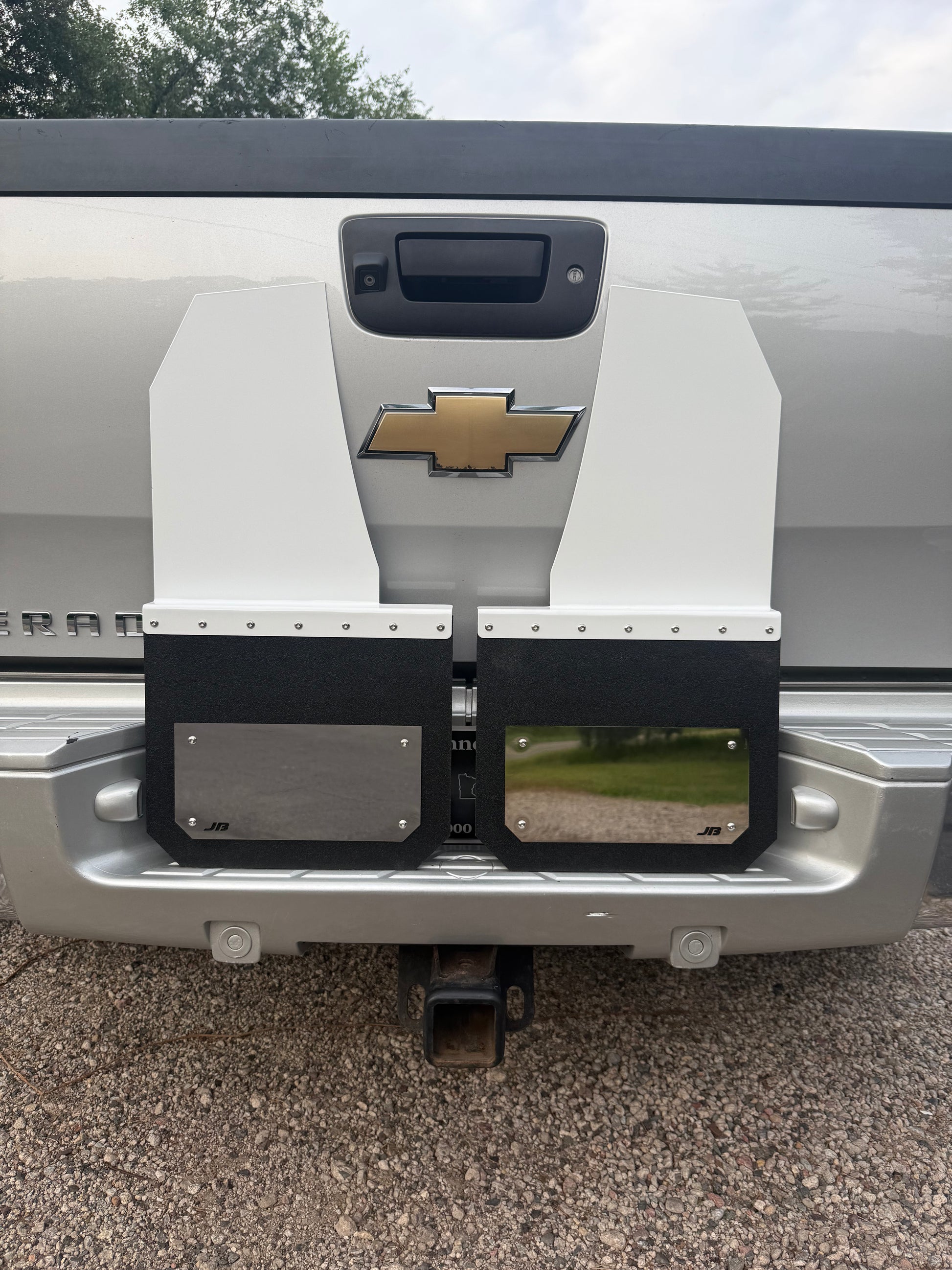 Keep your paint fresh and the cops off your butt with our kickback mudflaps! Whether your towing dump trailers to the jobsite or building your newest show truck, our mudflaps are the perfect accessory for that clean/functional look. We wanted to bring a you mudflap that will provide maximum protection all while adding a hint of style. With multiple widths, colors, and design options, the possibilities are endless. The straight kickback fits perfectly with Gm's plastic fender well extensions. Follow our guides below to ensure your getting exactly what you need!