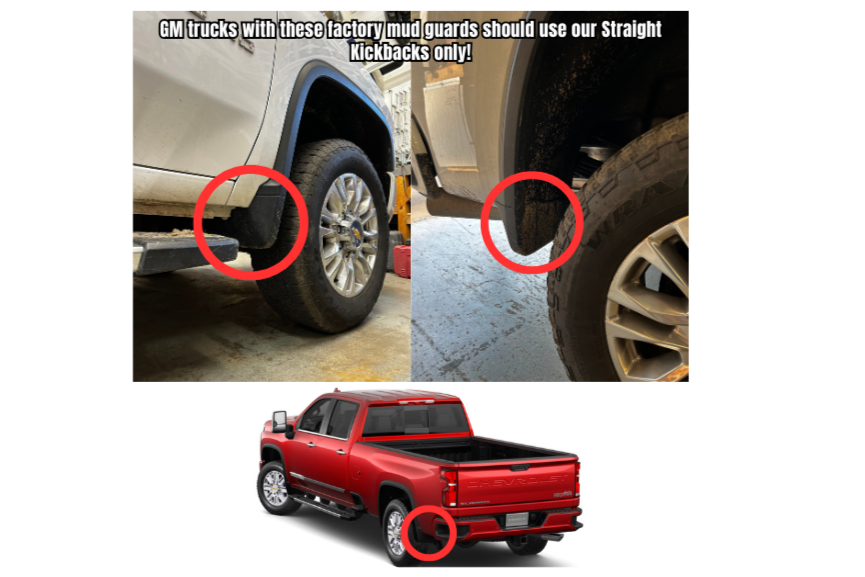 (Angled mudflaps will not work with the factory GM fender extensions that come on 2020+ GM's. Our straight kickback mudflap works better with those select trucks. Look at example photo for reference!)