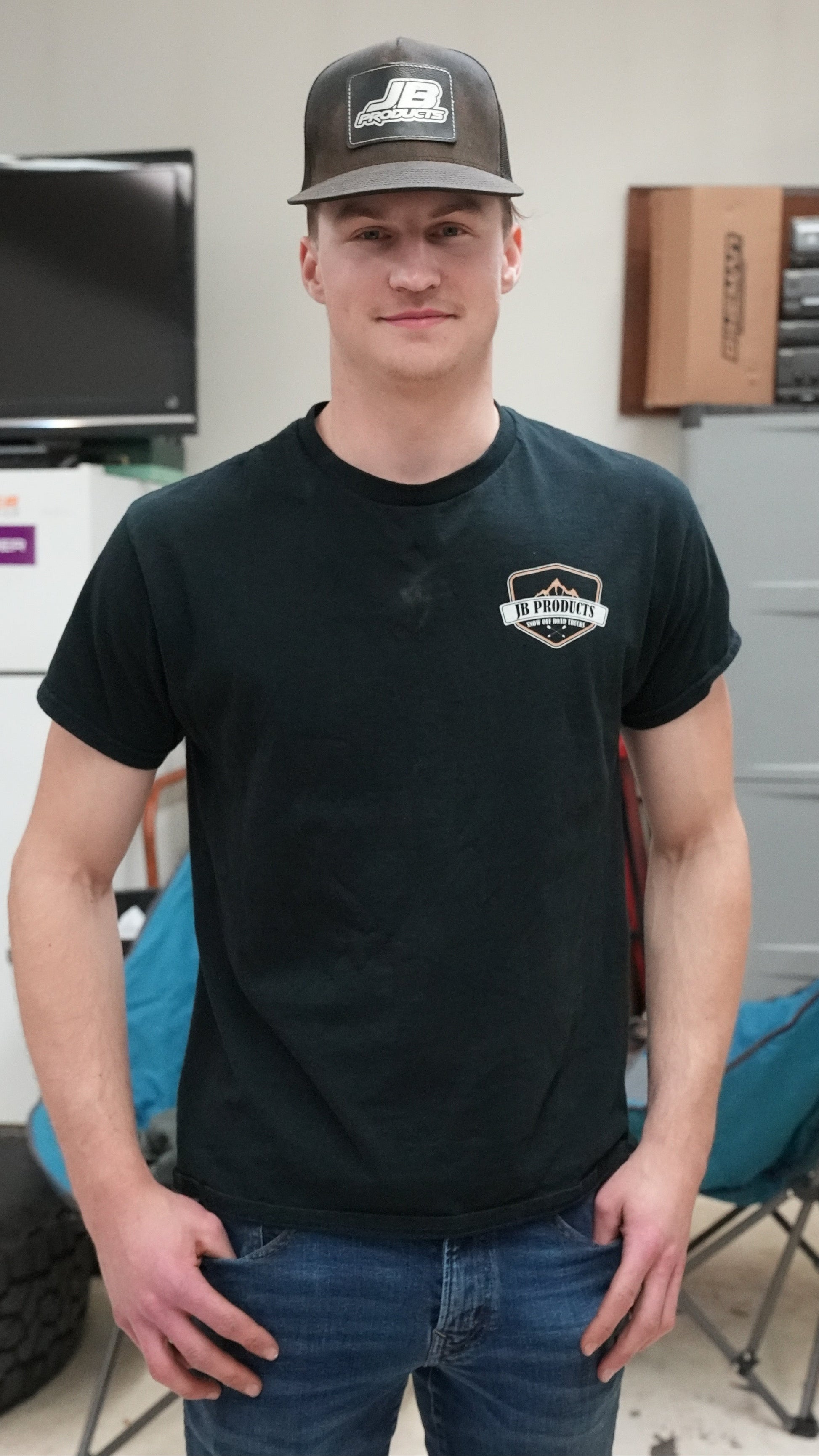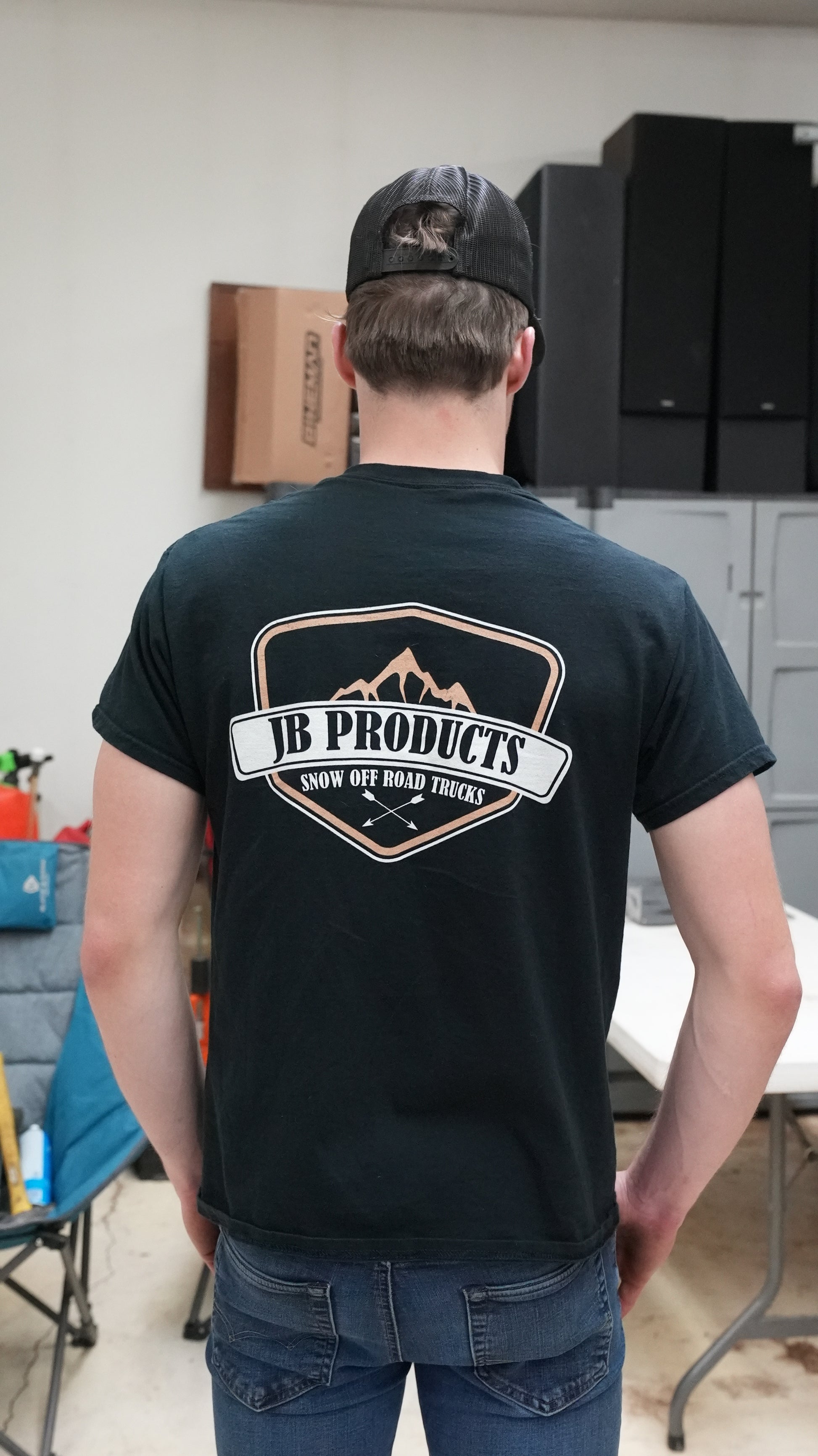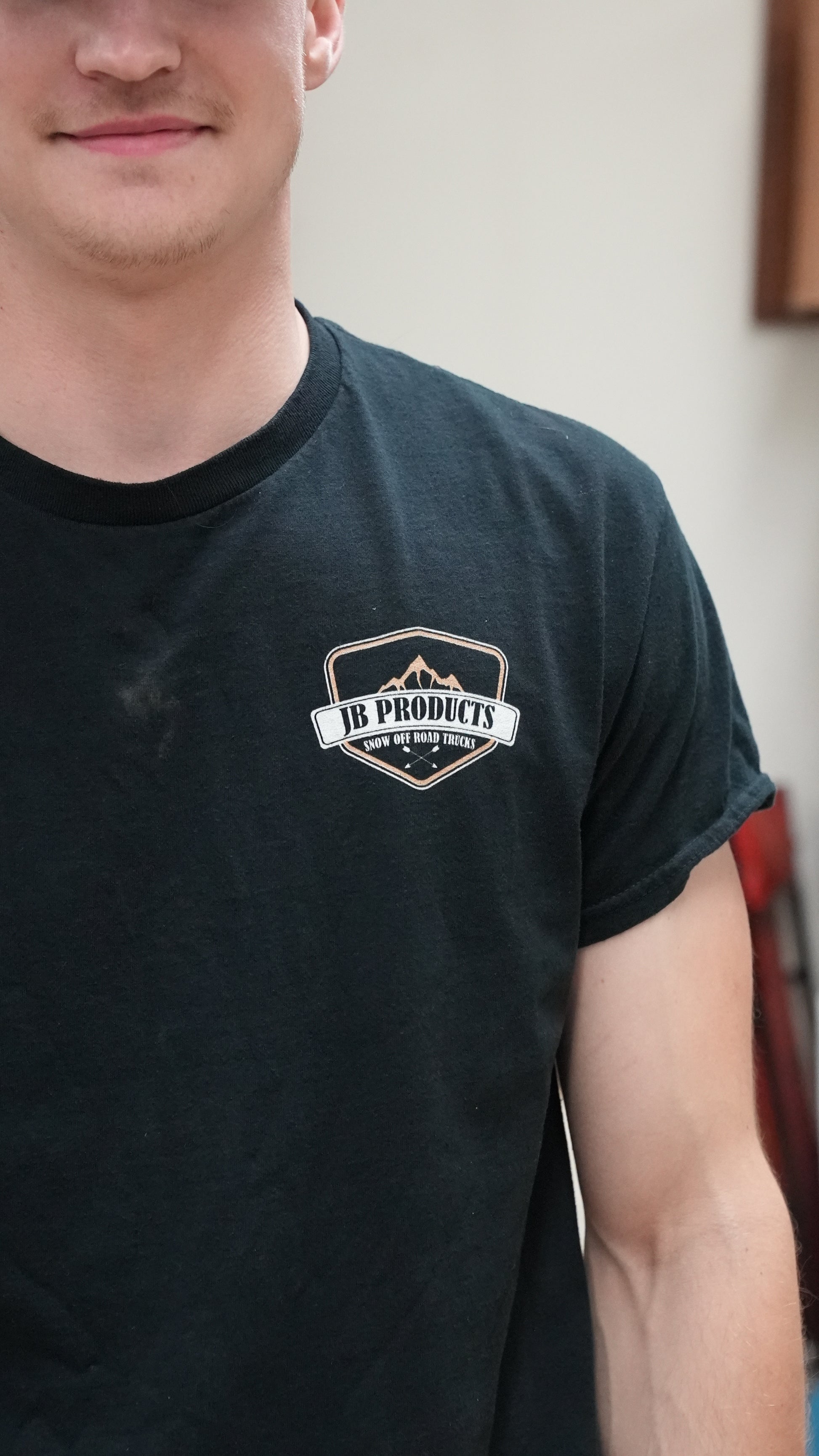 Show your support for JB Products by repping our merch! The PERFECT shirt for picking up chicks, working on trucks, or standing for podium pics. JB Products Mountain Tee in black with white and tan sublimination print.